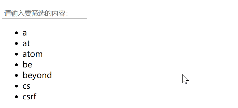 dataList: ['a', 'at', 'atom', 'be', 'beyond', 'cs', 'csrf'], // 管向后搜索的,删除不匹配的