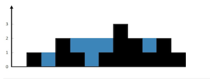 解释:上面是由数组 [0,1,0,2,1,0,1,3,2,1,2,1] 表示的高度图,在这种情况下,可以接 6 个单位的雨水(蓝色部分表示雨水)。