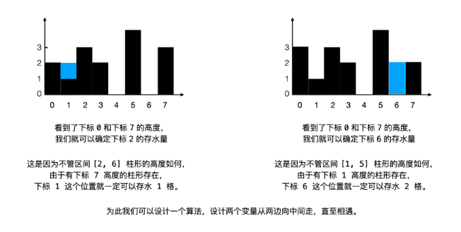设置两个和原始数组等长的数组,分别用来记录原数组左右两边的最大格子