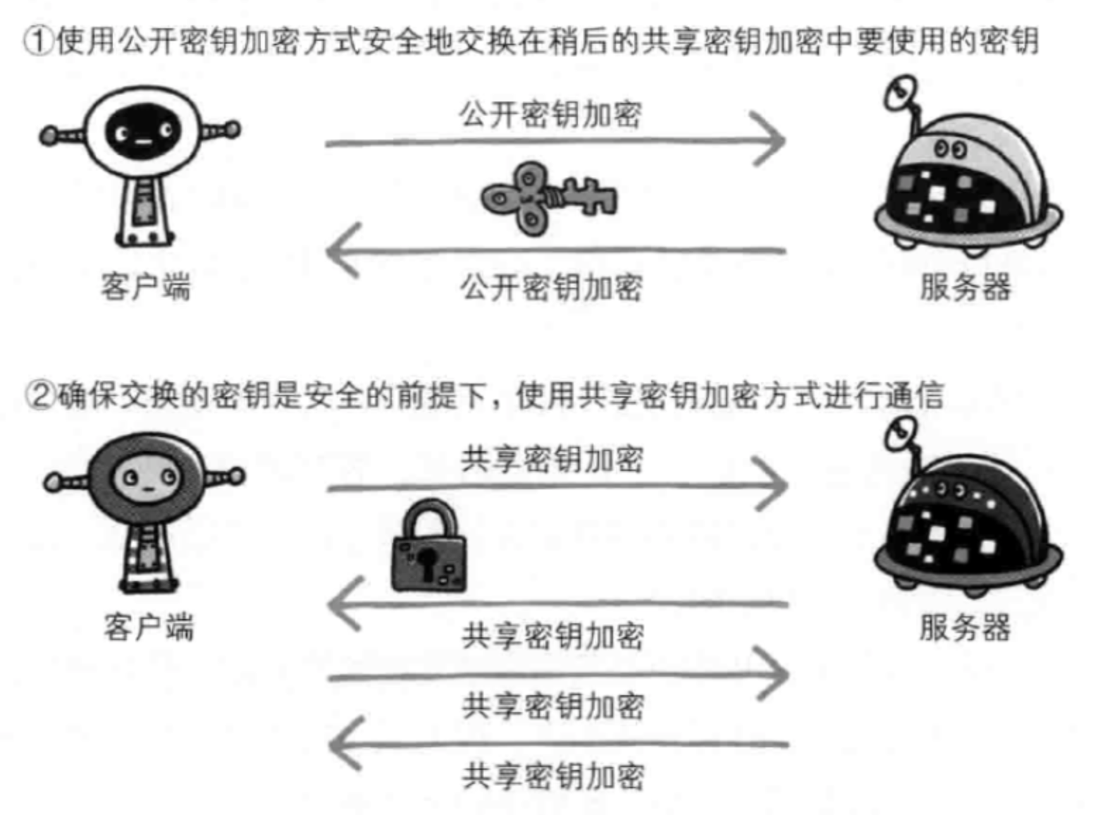https采取的方式是在交换密钥的环节中,使用公开密钥加密技术,之后在建立通信、进行报文交换的阶段则使用共享密钥加密技术。示意图如下:(从别处偷的,逃)