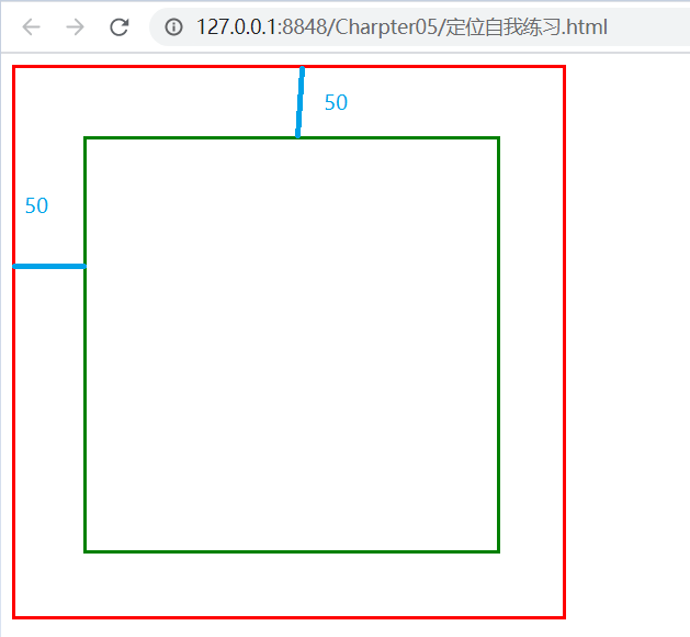<!DOCTYPE html> <html> <head> <meta charset="utf-8"> <title></title> <style type="text/css"> .box{ width: 400px; height: 400px; border: 2px solid red; /* position: relative; */ } .box1{ width: 300px; height: 300px; border: 2px solid green; position: absolute; top: 50px; left: 50px; } </style> </head> <body> <div class="box"> <div class="box1"></div> </div> </body> </html>
