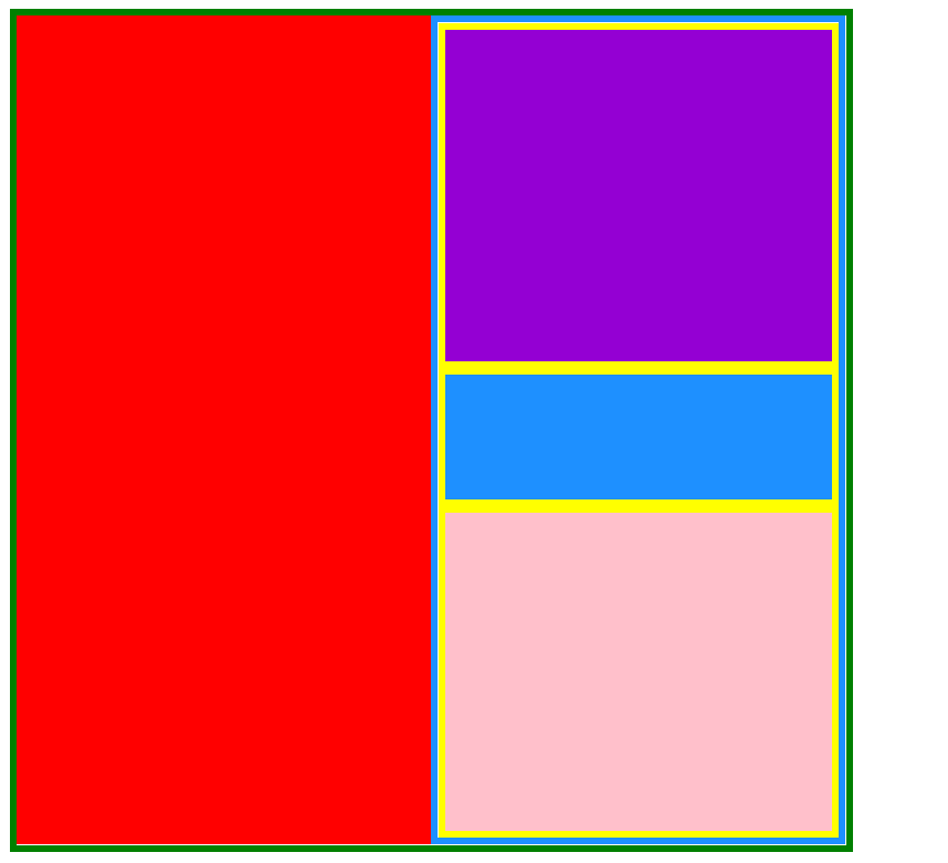 <!DOCTYPE html> <html> <head> <meta charset="UTF-8"> <title></title> <style type="text/css"> #div1{ width: 600px; height: 600px; border: 5px solid green; } #div2{ width: 300px; height: 600px; background-color: red; float:left; } #div3{ width: 290px; height: 590px; border: 5px solid dodgerblue; float:left; } #div4{ height: 240px; background-color: darkviolet; border: 5px solid yellow; } #div5{ height: 90px; background-color: dodgerblue; border: 5px solid yellow; } #div6{ height: 230px; background-color: pink; border: 5px solid yellow; } </style> </head> <body> <div id="div1"> <div id="div2"> </div> <div id="div3"> <div id="div4"> </div> <div id="div5"> </div> <div id="div6"> </div> </div> </div> </body> </html>
