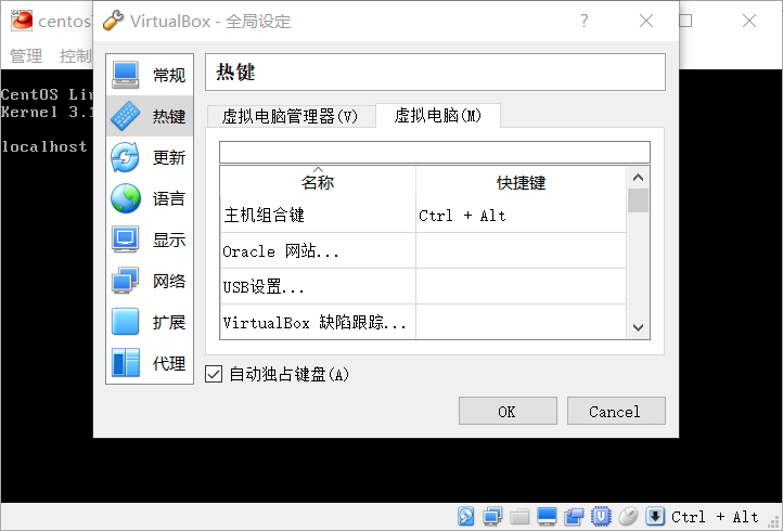 4、然后可以在管理-全局设定-热键-主机组合键里查看和设置退出聚焦的快捷键