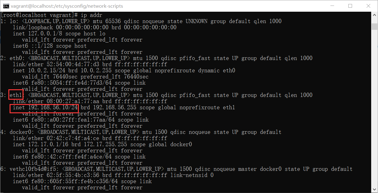 8、如果连不上外网,那么可能是由于 vagrant 的DNS 问题,首先先使用 ip addr 查看当前的ip地址是哪一个网卡,然后再去配置对应的网卡文件