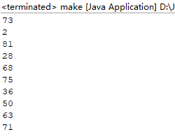 package work; import java.util.Random; public class make { public static void main(String[] args) { Random r = new Random(); for (int i = 0; i < 10; i++) { System.out.println(r.nextInt(100)); } } }