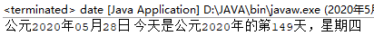 package work; import java.util.Date; import java.text.SimpleDateFormat; public class date { public static void main(String[] args) { SimpleDateFormat s1 = new SimpleDateFormat("Gyyyy年MM月dd日"); SimpleDateFormat s2=new SimpleDateFormat("今天是Gyyyy年的第D天,E"); Date d=new Date(); String a=s1.format(d); String b=s2.format(d); System.out.println(a+' '+b); } }