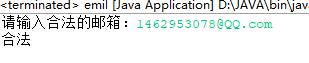 package work; import java.util.Scanner; public class emil { private static Scanner input; public static void main(String[] args) { Scanner input=new Scanner(System.in); System.out.print("请输入合法的邮箱:"); String str =input.nextLine(); int count=0; int count2=0; int x=0; int y=0; for(int j=0;j<str.length()-1;j++) { String str1=str.substring(j,j+1); if(str1.contentEquals("@")) { count++; x=j; } if(str1.contentEquals(".")) { count2++; y=j; } } if(count==1&&count2==1&&x<(y-1)&&x!=0&&y!=str.length()-1) { System.out.println("合法"); }else { System.out.println("不合法"); } } }