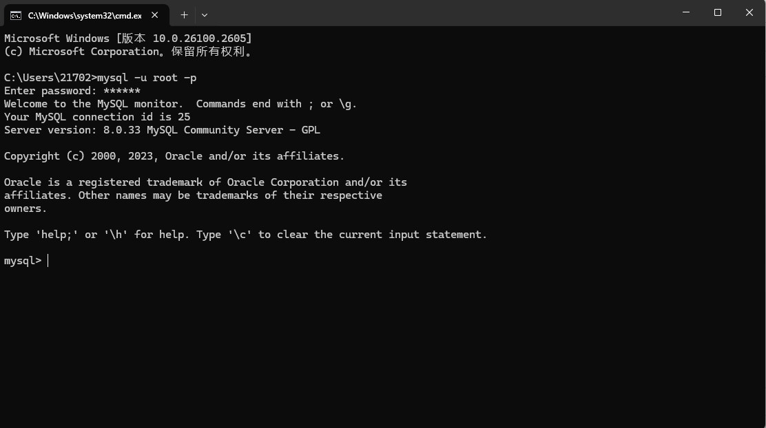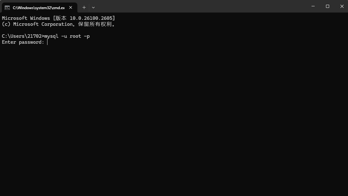 随后Win+R,输入cmd,回车进入命令行,输入mysql -u root -p,回车,会提示我们输入密码,就是刚刚设置的: