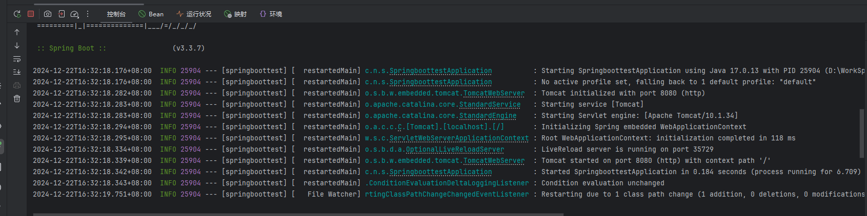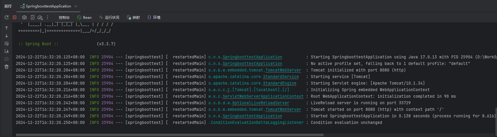 生成的项目打开src->main->java->com.neu.springboottest->SpringboottestApplication,点击运行main方法,出现下图成功: