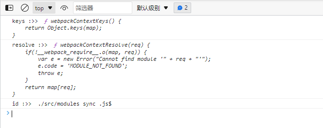 keys 和 resolve 都是函数,id 则是我们运行 require.context 传入的参数。而 keys 的运行结果就是我们需要的模块路径集合,需要在 ctx 传入参数以获取模块