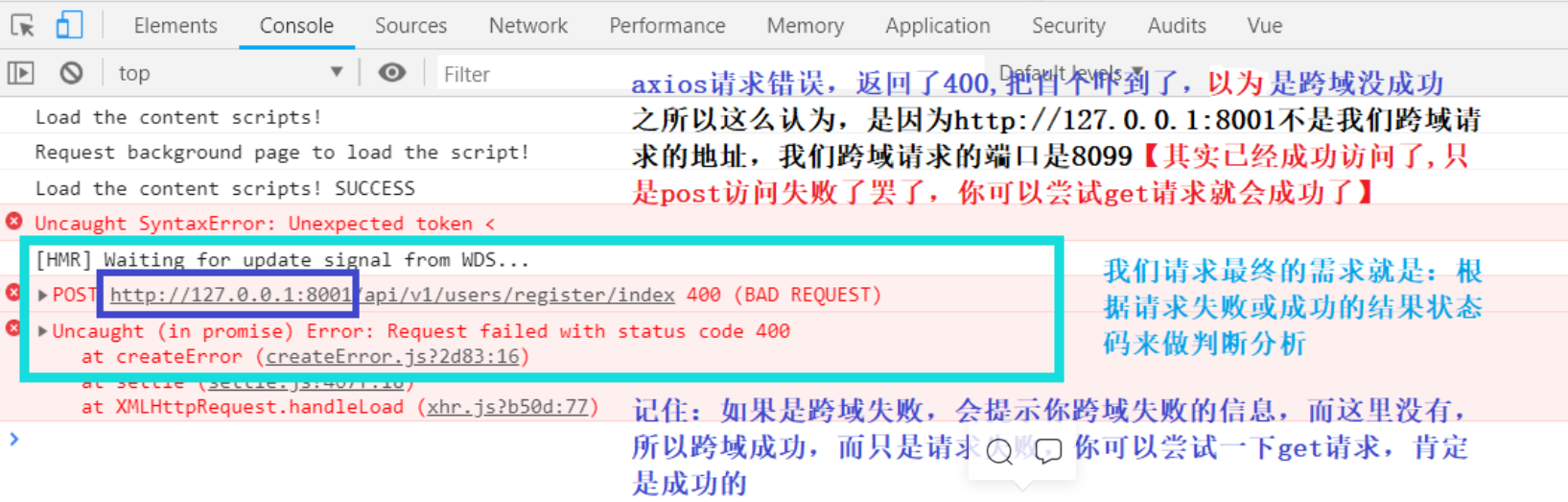 那么axios发送post请求不管成功状态码200,还是失败状态码400或其他,都接收到json格式,让我们前端知道具体是什么原因而请求失败呢【必须访问error.response响应对象】