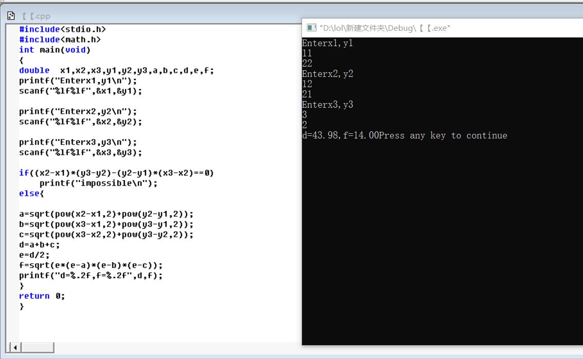f=sqrt(e*(e-a)*(e-b)*(e-c));