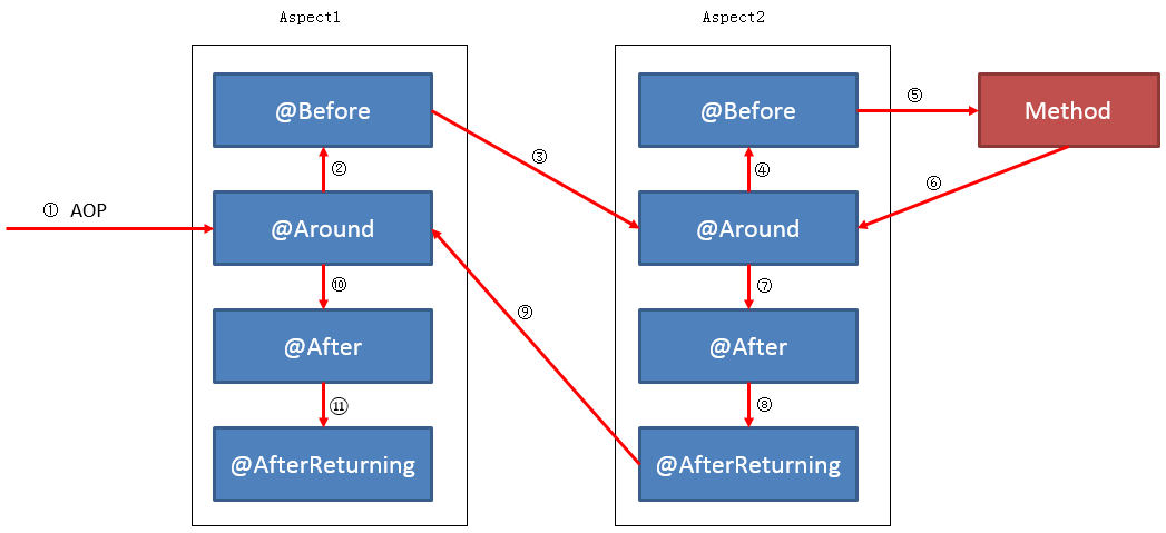 从Spring5.2.7开始,在相同@Aspect类中,通知方法将根据其类型按照从高到低的优先级进行执行:@Around,@Before ,@After,@AfterReturning,@AfterThrowing。