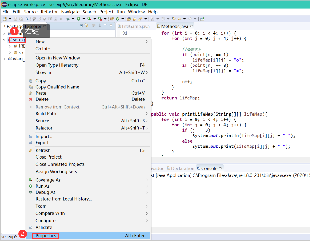 1 package lifegame; 2 3 public class Methods { 4 public Methods() { 5 } 6 7 //该方法检测所有位置,并返回对应位置的point数组 8 //用point数组,记录对应位置下一轮的状态,1下一代死,2下一代继续活,3下一代复活 9 public int[] check(String[][] lifeMap, int[] point) { 10 11 int n = 0; 12 //统计周围邻居的情况 13 for (int i = 0; i < 4; i++) { 14 for (int j = 0; j < 4; j++) { 15 16 /* 17 规则如下,进行判断 18 ( 1)一个人可以有8个邻居; 19 ( 2)一个人若只有一个邻居,在下一代会孤独的死去; 20 (3)若有2或3个邻居,在下一代依然活着; 21 (4)若有4个或以上邻居,在下一代会因拥挤而死; 22 (5)死去的人若有3个邻居,在下一代会复活; 23 (6)所有的死去或复活都在下一代变化时同时发生。 24 */ 25 26 //用life变量记录周围活着的邻居个数 27 int life = 0; 28 29 //1.判断正下方的位置 30 if (i + 1 < 4 && lifeMap[i + 1][j].equals("●")) { 31 life++; 32 } 33 34 //2.判断右下位置 35 if (i + 1 < 4 && j + 1 < 4 && lifeMap[i + 1][j + 1].equals("●")) { 36 life++; 37 } 38 39 //3.判断左下位置 40 if (i + 1 < 4 && j - 1 >= 0 && lifeMap[i + 1][j - 1].equals("●")) { 41 life++; 42 } 43 44 //4.判断右侧位置 45 if (j + 1 < 4 && lifeMap[i][j + 1].equals("●")) { 46 life++; 47 } 48 49 //5.判断左侧位置 50 if (j - 1 >= 0 && lifeMap[i][j - 1].equals("●")) { 51 life++; 52 } 53 54 //6.判断正上方位置 55 if (i - 1 >= 0 && lifeMap[i - 1][j].equals("●")) { 56 life++; 57 } 58 59 //7.判断右上位置 60 if (i - 1 >= 0 && j + 1 < 4 && lifeMap[i - 1][j + 1].equals("●")) { 61 life++; 62 } 63 64 //8.判断左上位置 65 if (i - 1 >= 0 && j - 1 >= 0 && lifeMap[i - 1][j - 1].equals("●")) { 66 life++; 67 } 68 69 //用一个数组,记录对应位置下一轮的状态,1下一代死,2下一代继续活,3下一代复活 70 if (lifeMap[i][j].equals("●")) { 71 if (life == 1) 72 point[n] = 1; 73 else if (life == 2 || life == 3) 74 point[n] = 2; 75 else if (life >= 4) 76 point[n] = 1; 77 } else { 78 if (life == 3) 79 point[n] = 3; 80 } 81 n++; 82 } 83 } 84 return point; 85 } 86 87 public String[][] getNext(String[][] lifeMap, int[] point) { 88 89 int n = 0; 90 for (int i = 0; i < 4; i++) { 91 for (int j = 0; j < 4; j++) { 92 93 //变更状态 94 if (point[n] == 1) 95 lifeMap[i][j] = "○"; 96 if (point[n] == 3) 97 lifeMap[i][j] = "●"; 98 99 n++; 100 } 101 } 102 return lifeMap; 103 } 104 105 public void printLifeMap(String[][] lifeMap){ 106 for (int i = 0; i < 4; i++) { 107 for (int j = 0; j < 4; j++) { 108 if (j == 3) 109 System.out.println(lifeMap[i][j] + " "); 110 else 111 System.out.print(lifeMap[i][j] + " "); 112 } 113 } 114 } 115 }