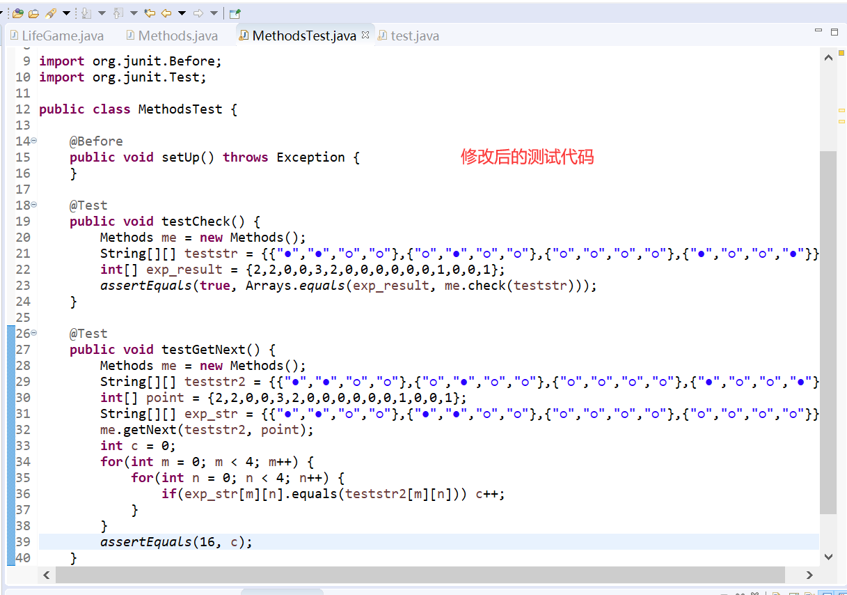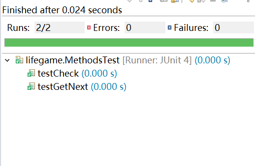 1 package lifegame; 2 3 import static org.junit.Assert.*; 4 5 import java.lang.reflect.Array; 6 import java.util.ArrayList; 7 import java.util.Arrays; 8 9 import org.junit.Before; 10 import org.junit.Test; 11 12 public class MethodsTest { 13 14 @Before 15 public void setUp() throws Exception { 16 } 17 18 @Test 19 public void testCheck() { 20 Methods me = new Methods(); 21 String[][] teststr = {{"●","●","○","○"},{"○","●","○","○"},{"○","○","○","○"},{"●","○","○","●"}}; 22 int[] exp_result = {2,2,0,0,3,2,0,0,0,0,0,0,1,0,0,1}; 23 assertEquals(true, Arrays.equals(exp_result, me.check(teststr))); 24 } 25 26 @Test 27 public void testGetNext() { 28 Methods me = new Methods(); 29 String[][] teststr2 = {{"●","●","○","○"},{"○","●","○","○"},{"○","○","○","○"},{"●","○","○","●"}}; 30 int[] point = {2,2,0,0,3,2,0,0,0,0,0,0,1,0,0,1}; 31 String[][] exp_str = {{"●","●","○","○"},{"●","●","○","○"},{"○","○","○","○"},{"○","○","○","○"}}; 32 me.getNext(teststr2, point); 33 int c = 0; 34 for(int m = 0; m < 4; m++) { 35 for(int n = 0; n < 4; n++) { 36 if(exp_str[m][n].equals(teststr2[m][n])) c++; 37 } 38 } //判断生成串是否与期望串相等 39 assertEquals(16, c); 40 } 41 }