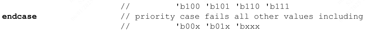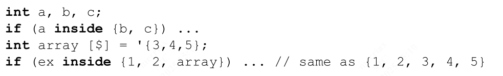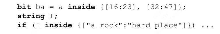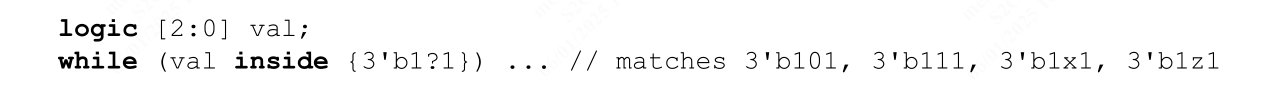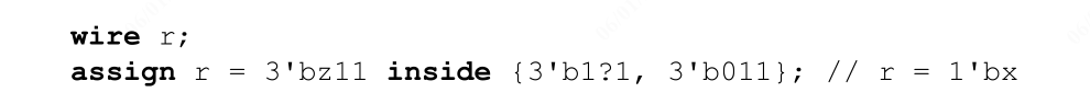 整数表达式则使用通配符等式运算符 (==?),这样集合中的值如果在某一位上有 x 或 z 位,它将被视为该位位置的“无关”位(参见 11.4.6)。与通配符等式相似,inside 运算符左侧表达式中的 x 或 z 不会被视为“无关”位。