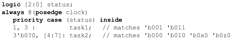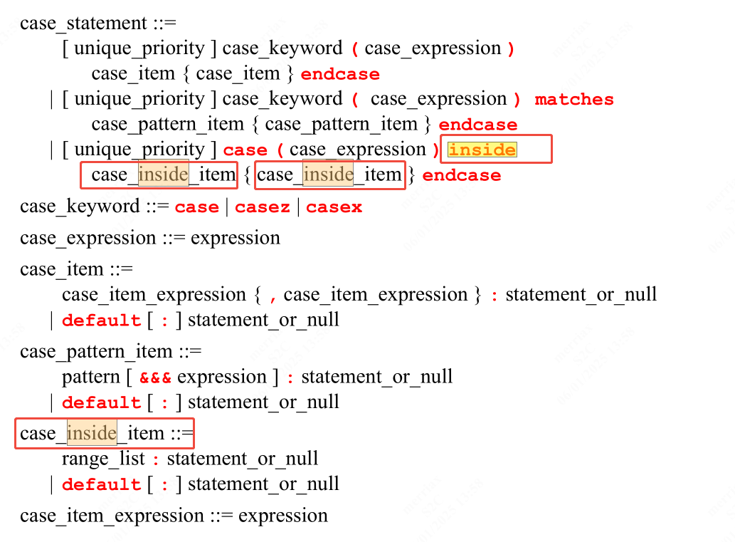 inside 关键字可以在括号表达式后使用,以表示集合成员资格(见 11.4.13)。在 case-inside 语句中,case_expression 将与每个 case_item_expression(范围列表)进行比较,使用集合成员资格 inside 运算符。inside 运算符使用不对称通配符匹配(见 11.4.6)。因此,case_expression 将是左操作数,而每个 case_item_expression 将是右操作数。case_expression 和每个 case_item_expression 在大括号中的表达式将按照普通 case 语句、唯一 case 语句或优先级 case 语句指定的顺序进行求值。