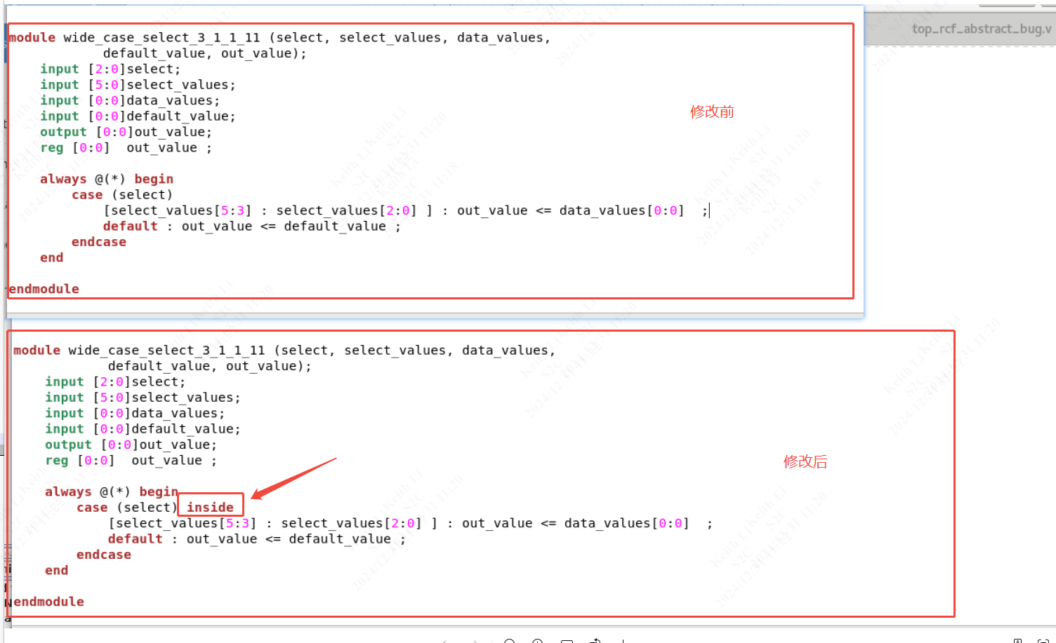当 inside 操作将 case_expression 与 case_item_expression 进行比较时,如果返回 1'b1(匹配),则 case_item 被认为匹配;如果返回 1'b0 或 1'bx(不匹配),则认为没有匹配。如果所有比较都不匹配,并且给出了默认项,则将执行默认项语句。
