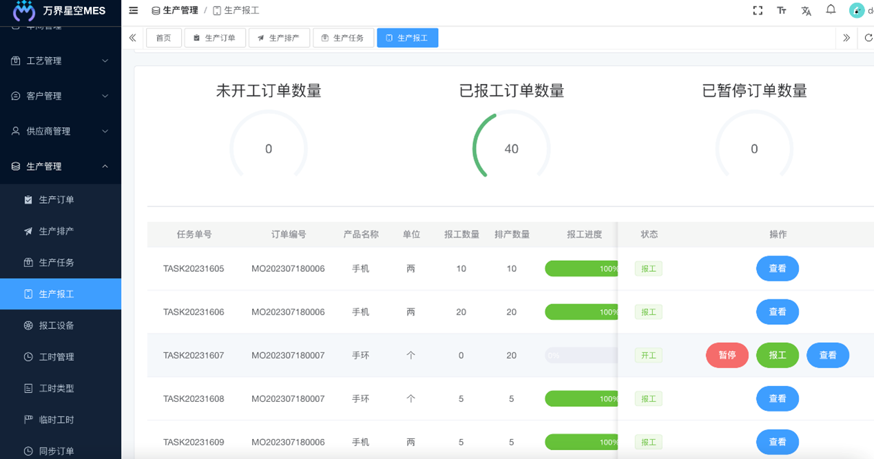 生产报工管理:员工可自行查看生产任务,生产完成后,员工点击完工,结束操作,汇报任务,更新订单生产进度等,管理层也可随时随地在设备上或移动端查看任务完成情况。
