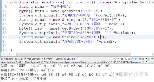 但是乱码不要紧啊,这个乱码只是个中间过程,不需要显示出来。紧接着用ISO-8859-1再编码,那么,编码出的字节是跟UTF-8编码的字节是相同的。