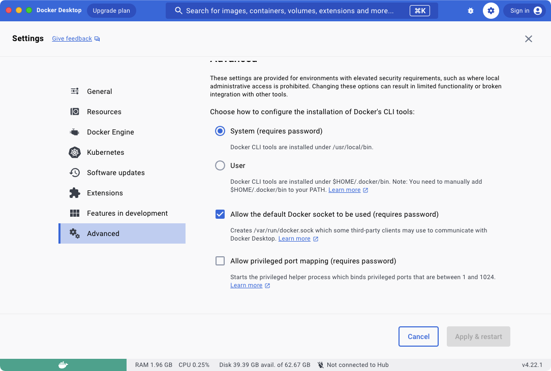 docker context list exec: "com.docker.cli": executable file not found in $PATH,Cannot connect to the Docker daemon at unix:///var/run/docker.sock. Is the Docker daemon running?,奇怪了,因为我的命令行环境是可以运行docker命令的,但是在vscode却不行,折腾了一天,最后发现在docker dashboard程序的setting中,需要设置Docker's CLI tools为system,如图所示,这样vscode的两个插件dev containers插件和docker插件就可以正常使用了。