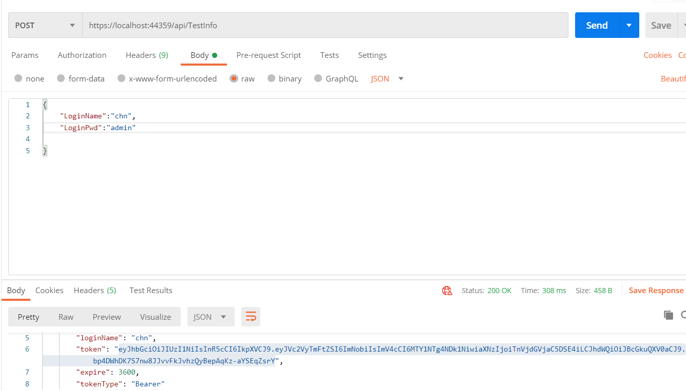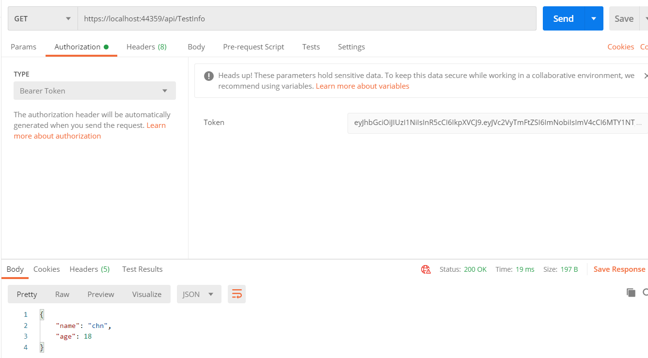 [Route("api/[controller]")] [ApiController] public class TestInfo : ControllerBase { private readonly IConfiguration _configuration; public TestInfo(IConfiguration configuration) { _configuration = configuration; } [Authorize] [HttpGet] public IActionResult UserInfo() { return Ok(new { Name = "chn", Age = 18 }); } [HttpPost] public IActionResult GetToken(User u) { if (u == null || string.IsNullOrEmpty(u.LoginName) || string.IsNullOrEmpty(u.LoginPwd)) { return Ok(new { code = -1, msg = "用户名或密码不能为空" }); } //验证用户 if (u.LoginName != "chn" && u.LoginPwd != "admin") { return Ok(new { code = -1, msg = "用户名或密码错误" }); } //验证成功,构建Token string strToken = GenerateToken(u); //返回信息 return Ok(new { code = 1, msg = "Success", data = new { LoginName = u.LoginName, Token = strToken, Expire = 3600, TokenType = JwtBearerDefaults.AuthenticationScheme } }); } private string GenerateToken(User u) { //这里也是从配置文件读取的,和上面读取的一致,否则开启对应验证的话会不通过 string secret = "Nuc#techjjfa3bchn"; string issuer_z = "Nuctech.CHN"; string audience_z = "Api.Auth"; //指定加密算法 var securityKey = new SigningCredentials(new SymmetricSecurityKey(Encoding.ASCII.GetBytes(secret)), SecurityAlgorithms.HmacSha256); //可以在Token里增加信息,但这里不要加私密信息,比如密码等这种数据 var claims = new Claim[] { new Claim("UserName", u.LoginName) }; //组装数据 SecurityToken securityToken = new JwtSecurityToken( issuer: issuer_z,//颁发者 audience: audience_z,//接收者 signingCredentials: securityKey,//组装的秘钥 expires: DateTime.Now.AddSeconds(30),//有效时间 claims: claims ); //生成Token return new JwtSecurityTokenHandler().WriteToken(securityToken); } } public class User { public string LoginName { get; set; } public string LoginPwd { get; set; } }