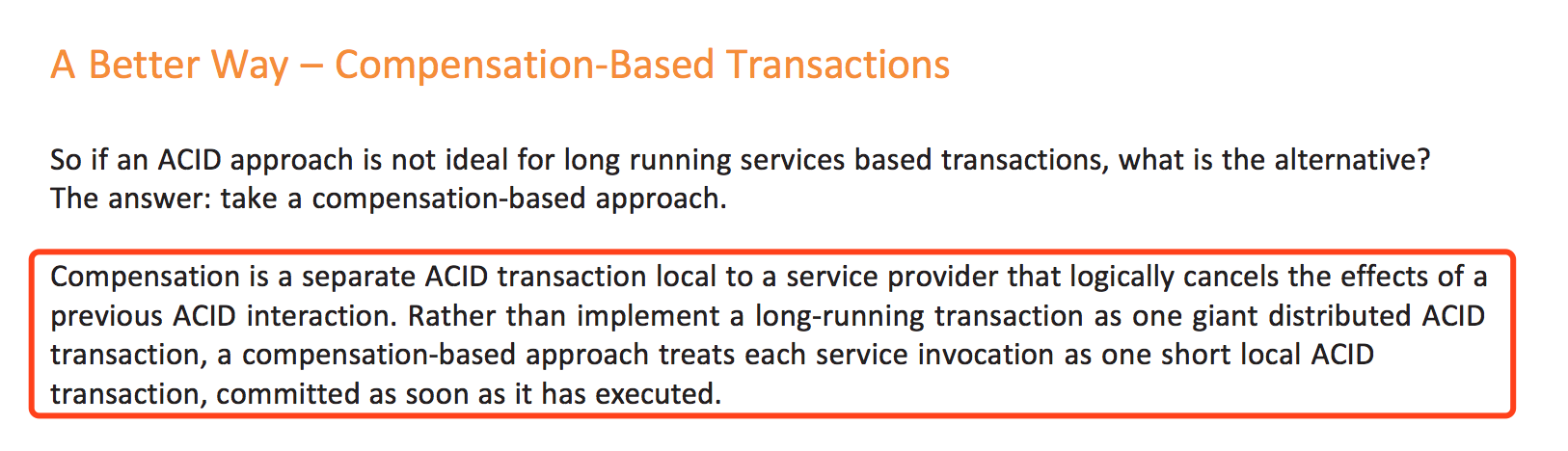 翻译过来就是:补偿是一个独立的支持ACID特性的本地事务,用于在逻辑上取消服务提供者上一个ACID事务造成的影响,对于一个长事务(long-running transaction),与其实现一个巨大的分布式ACID事务,不如使用基于补偿性的方案,把每一次服务调用当做一个较短的本地ACID事务来处理,执行完就立即提交