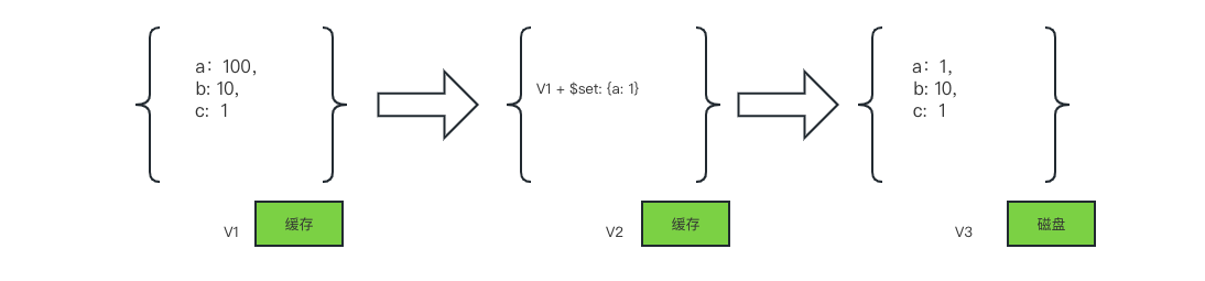再说写数据,db.test.update({_id:1},{$set:{a:1}}); 对于该条更新操作,MongoDB会以如下方式进行。