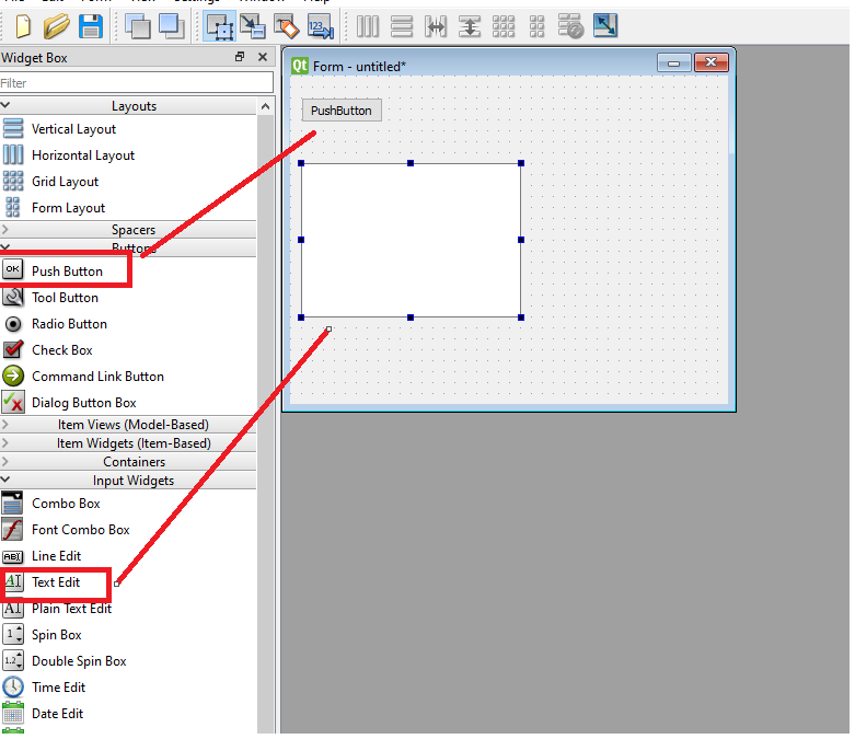 然后就会出现Qt Designer主界面,向Form中分别拖入一个“Push Button”和一个“Text Edit”,如下图: