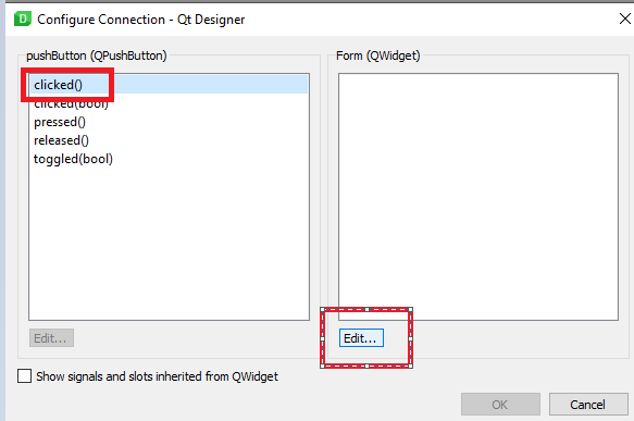 随后就出现了如下界面,在对话框左侧选中“clicked()”,右侧点击“Edit”