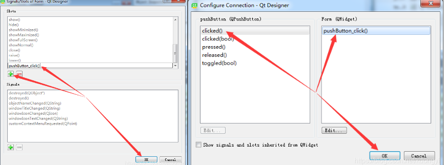 然后点击绿色“+”按钮,指定click事件的响应函数,名称随意,比如我这里命名为“pushButton_click()”