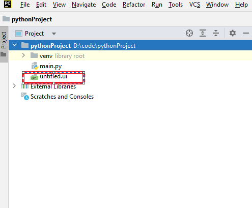 关闭QT Designer回到PyCharm,查看项目,可以看到只有刚才保存的untitled.ui文件在PyCharm是打不开的,我们需要将这个文件转成.py代码才能使用。