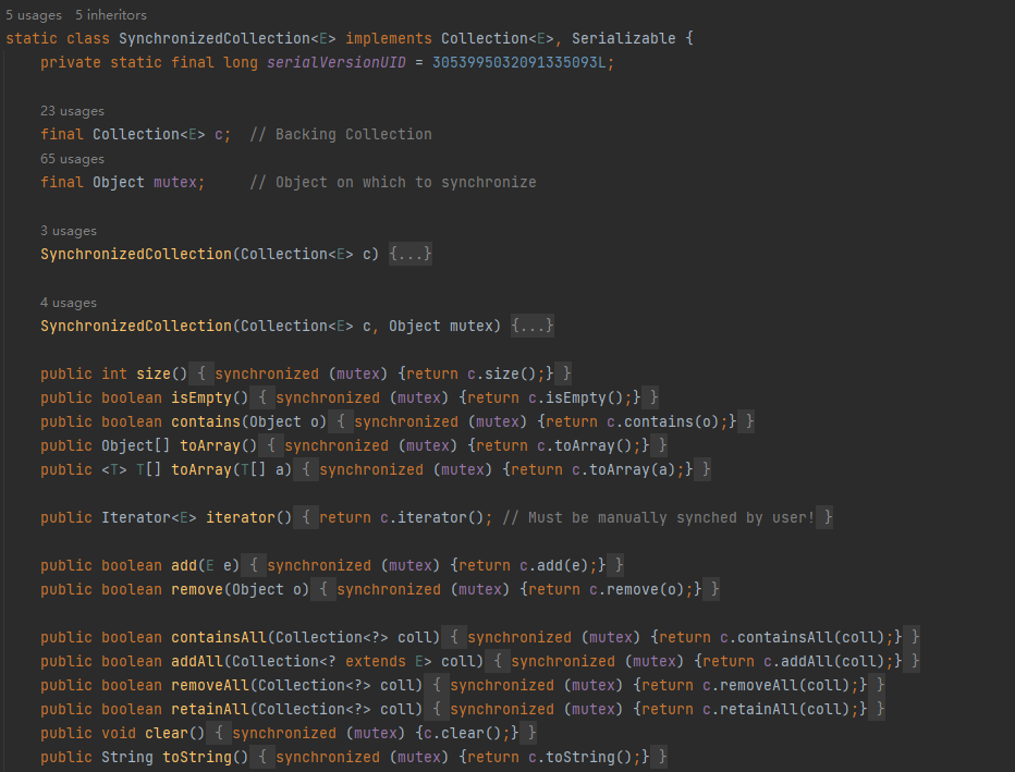 在Java中,大部分集合是非线程安全的,然而,在 java.util.Colletions 中,实现了 Synchronized 相关类,装饰非线程安全的 java.util.Colletion 实现类,将其包装为线程安全的实现类。