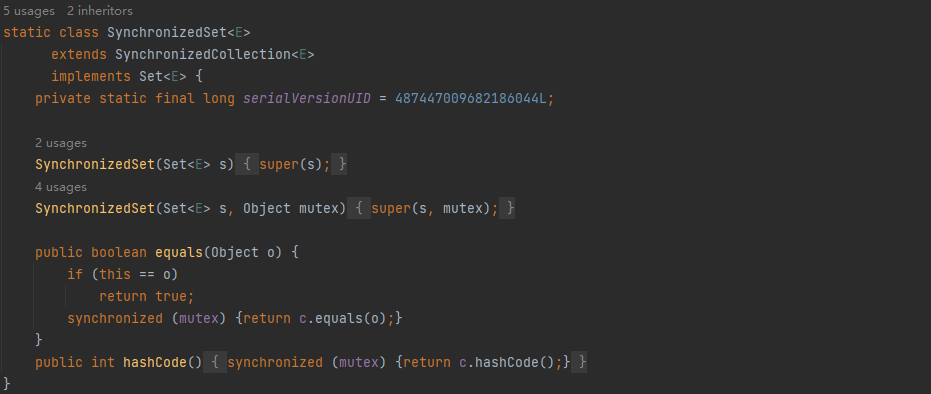 而对应的 Synchronized 类作为拓展类,拓展了线程安全的功能。如 SynchronizedSet: