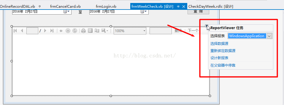 <span style="font-size:18px;"><strong>Private Sub cmdQuery_Click(sender As Object, e As EventArgs) Handles cmdQuery.Click Dim dateinfo As New Entity.DayWeekEntity Dim dayweekfac As New Facade.DayWeekFac Dim table As DataTable dateinfo.StartDate = Format(DTPstart.Value, "yyyy-MM-dd") dateinfo.StopDate = Format(DTPstop.Value, "yyyy-MM-dd") 'table为依据查询条件返回的datatable table = dayweekfac.GetWeekInfo(dateinfo) Dim rptDataSource As New ReportDataSource '声明数据源对象 rptDataSource.Name = "DataSet1" '设置报表数据集名称 rptDataSource.Value = table '设置数据源实例 ReportViewer1.LocalReport.ReportEmbeddedResource = "WindowsApplication1.CheckDayWeek.rdlc" ReportViewer1.LocalReport.DataSources.Clear() ReportViewer1.LocalReport.DataSources.Add(rptDataSource) Me.ReportViewer1.RefreshReport() End Sub</strong></span>