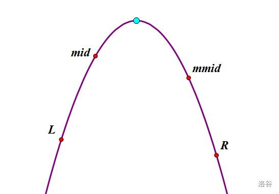f(mid) > f(mmid)的时候,我们可以断定mmid一定在蓝点的右边。
