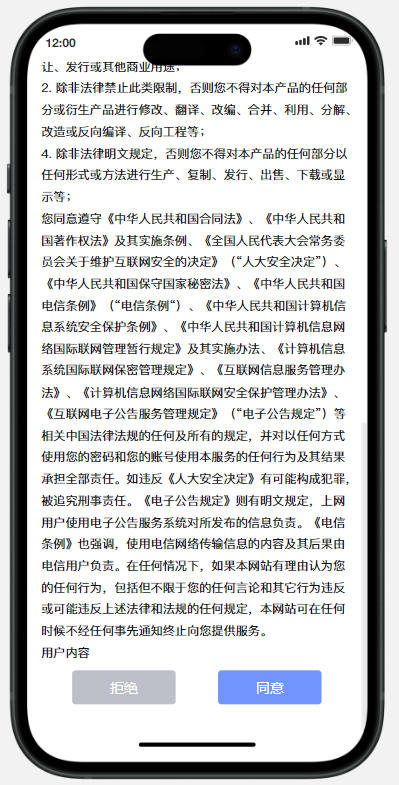 操作步骤:用户输入账号和密码,点击登录按钮。翻看服务协议并点击下方同意按钮,拒绝将返回登录界面