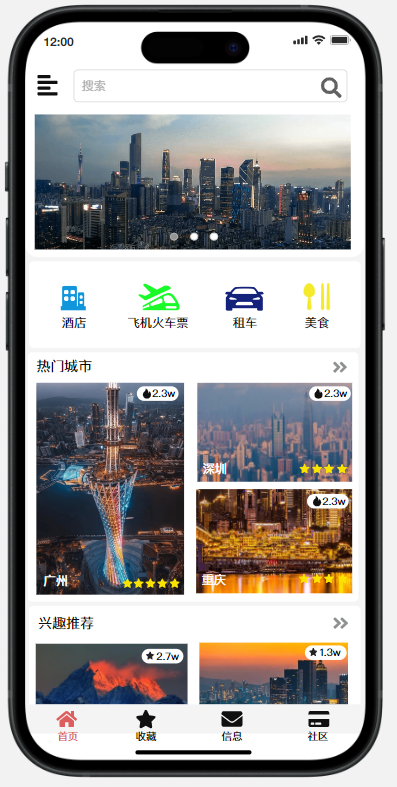 界面功能:展示热门城市推荐、兴趣推荐、旅游资讯等。