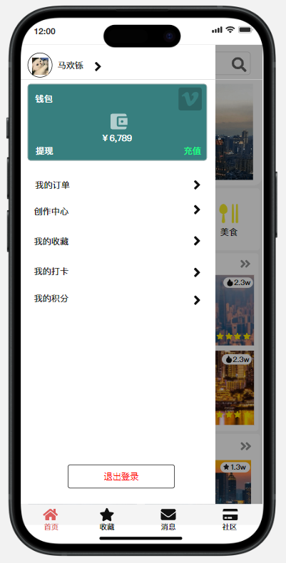 界面功能:展示用户个人信息、充值提现、查询订单、积分、查看收藏等等。
