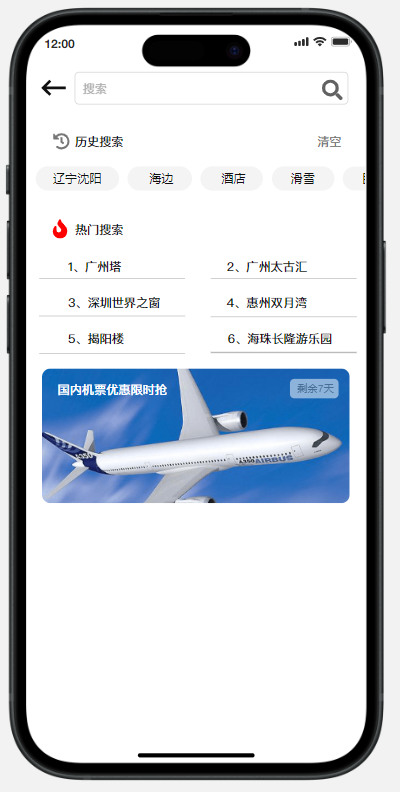 界面组成:包括搜索框、热门搜索词、历史搜索、广告等区域。