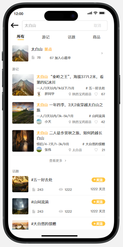 目的地搜索:提供全面的目的地搜索功能,包括景点、其他用户发布相关地点游记、旅游团、交通、民宿等。