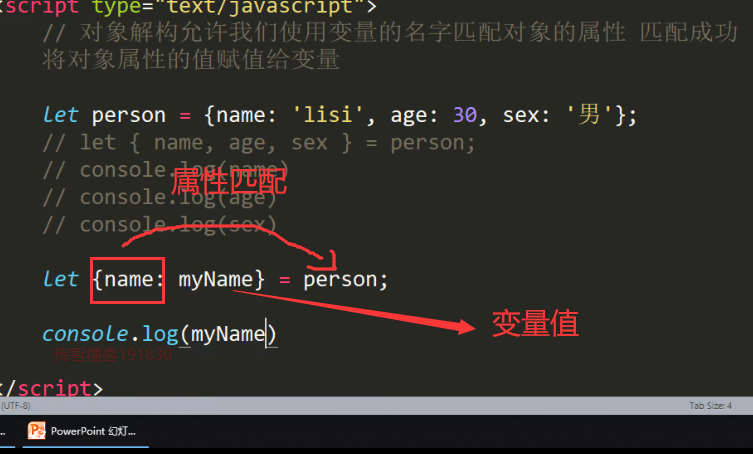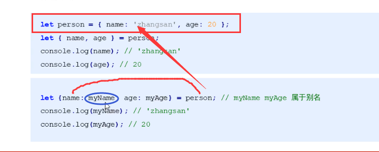 相当于重新命名了对象里的属性,{name:myName} = personObj 相当于将对象里的name属性值重新赋值给新定义的myName属性