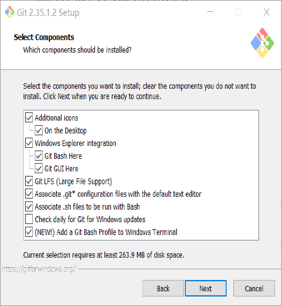 √ (NEW!)Add a Git Bash Profile to Windows Terminal:将Git Bash的配置文件添加在Windows终端中的配置文件中(这是2.34.1版本新增的功能,省去了自己额外单独添加) 大家可以按照上述截图进行勾选,也可以自己根据组件含义进行勾选自己需要的组件,之后点击Next。