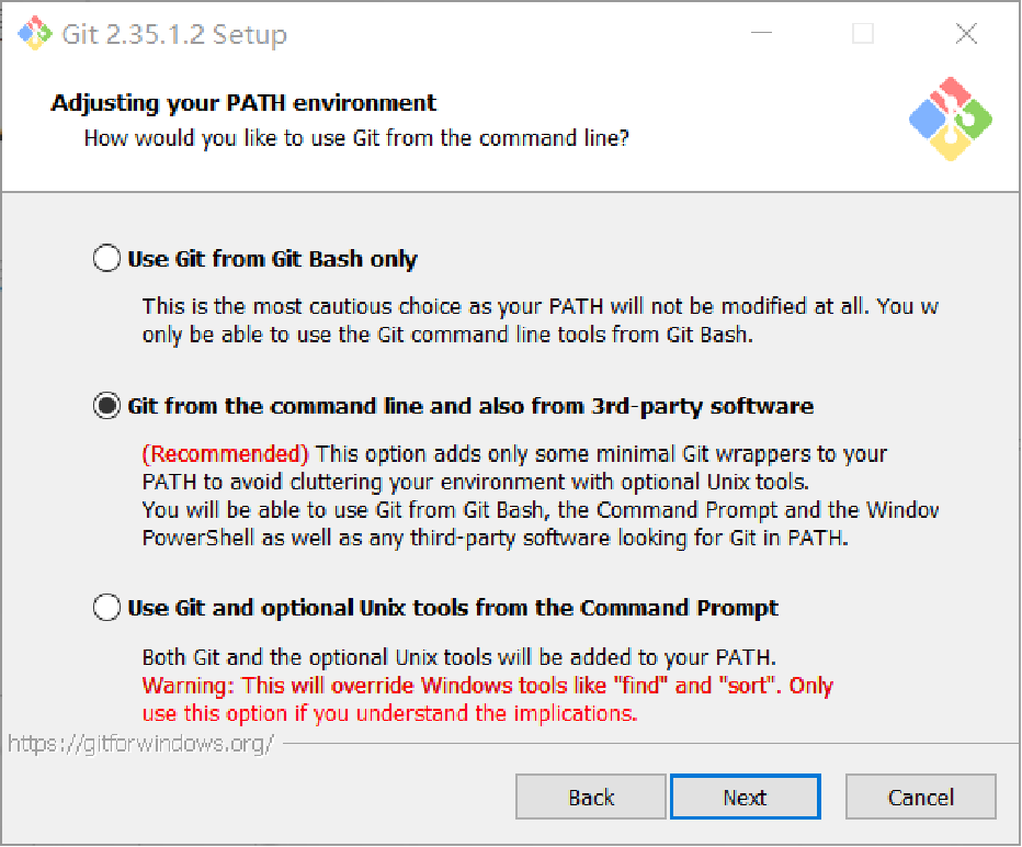 第三种配置是“从命令提示符使用Git和可选的Unix工具”。警告:这将覆盖Windows工具,如 “ find 和 sort ”。只有在了解其含义后才使用此选项。
