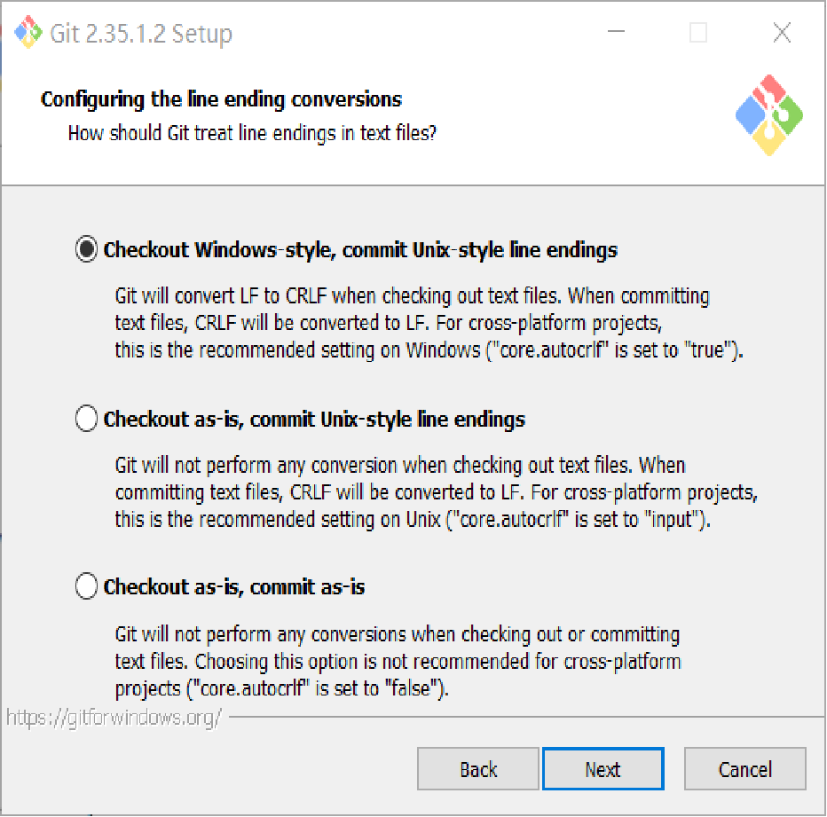 第一个选项是“签出Windows风格,提交Unix风格的行尾”。签出文本文件时,Git会将LF转换为CRLF。提交文本文件时,CRLF将转换为LF。对于跨平台项目,这是Windows上的推荐设置(“ core.autocrlf”设置为“ true”)