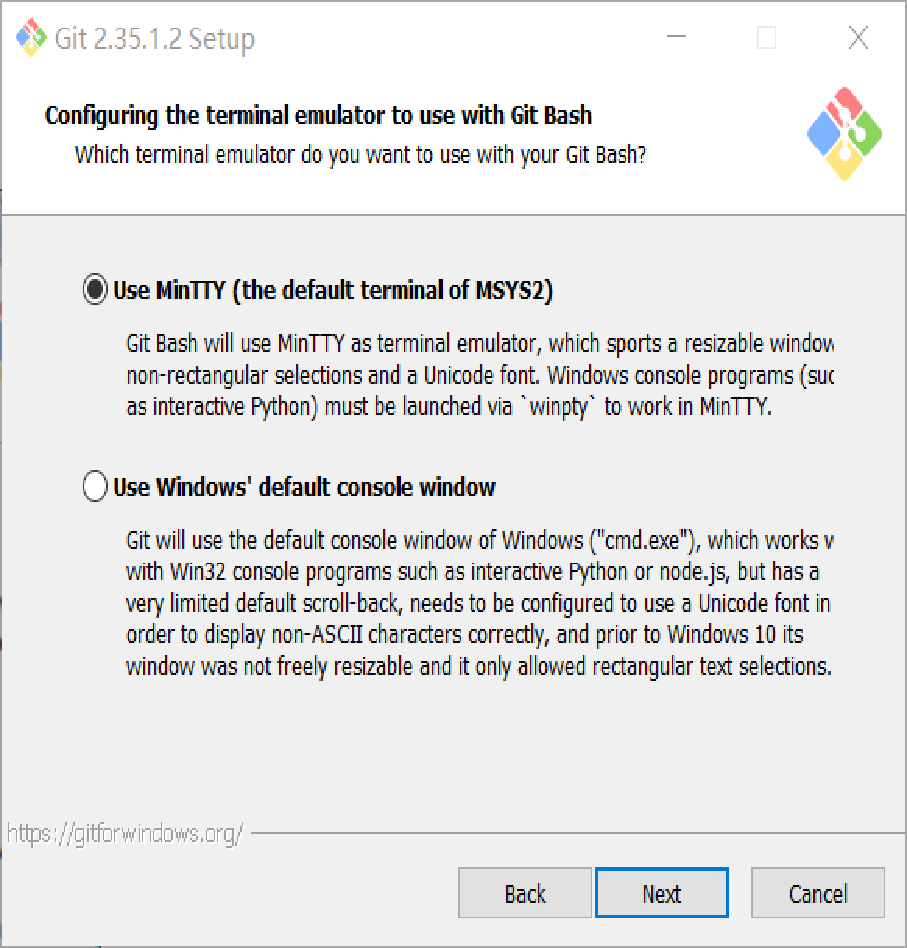 第一个选项是“使用MinTTY(MSYS2的默认终端)”。Git Bash将使用MinTTY作为终端模拟器,该模拟器具有可调整大小的窗口,非矩形选择和Unicode字体。Windows控制台程序(例如交互式Python)必须通过“ winpty”启动才能在MinTTY中运行。