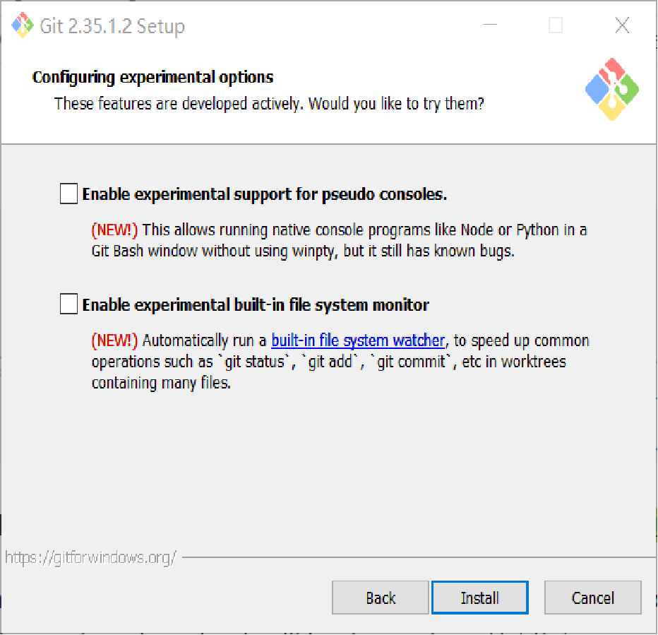 √ Enable experimental support for pseudo consoles:启用对伪控制台的实验支持 this allows running native console programs like Node or Python in a Git Bash window without using winpty,but it still has known bugs.这允许在不使用 winpty 的情况下在 Git Bash 窗口中运行本地控制台程序,如 Node 或 Python,但它仍然存在已知错误.