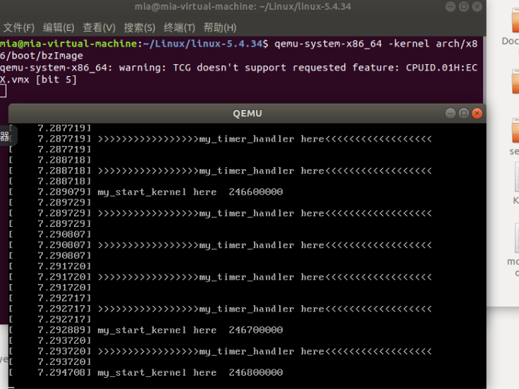 在mykernel目录下,可以看到mymain.c和myinterrupt.c,mymain.c中的代码在不停地执行,同时有一个中断处理程序的上下文环境,周期性地产生时钟中断信号,能够触发myinterrupt.c中的代码。