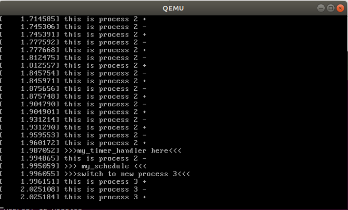 void my_process(void) { int i = 0; while(1) { i++; if(i%10000000 == 0) { printk(KERN_NOTICE "this is process %d -\n",my_current_task->pid); if(my_need_sched == 1) { my_need_sched = 0; my_schedule(); } printk(KERN_NOTICE "this is process %d +\n",my_current_task->pid); } } }
