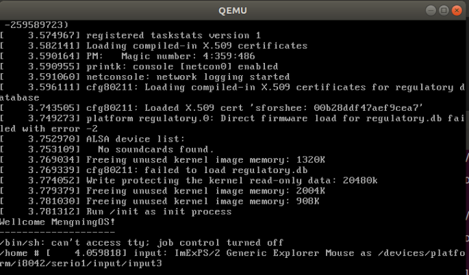 #!/bin/sh mount -t proc none /proc mount -t sysfs none /sys echo "Wellcome TestOS!" echo "--------------------" cd home /bin/sh #给init脚本添加可执行权限 chmod +x init #打包成内存根文件系统镜像 find . -print0 | cpio --null -ov --format=newc | gzip -9 > ../rootfs.cpio.gz #测试挂载根文件系统,看内核启动完成后是否执行init脚本 qemu-system-x86_64 -kernel linux-5.4.34/arch/x86/boot/bzImage -initrd rootfs.cpio.gz